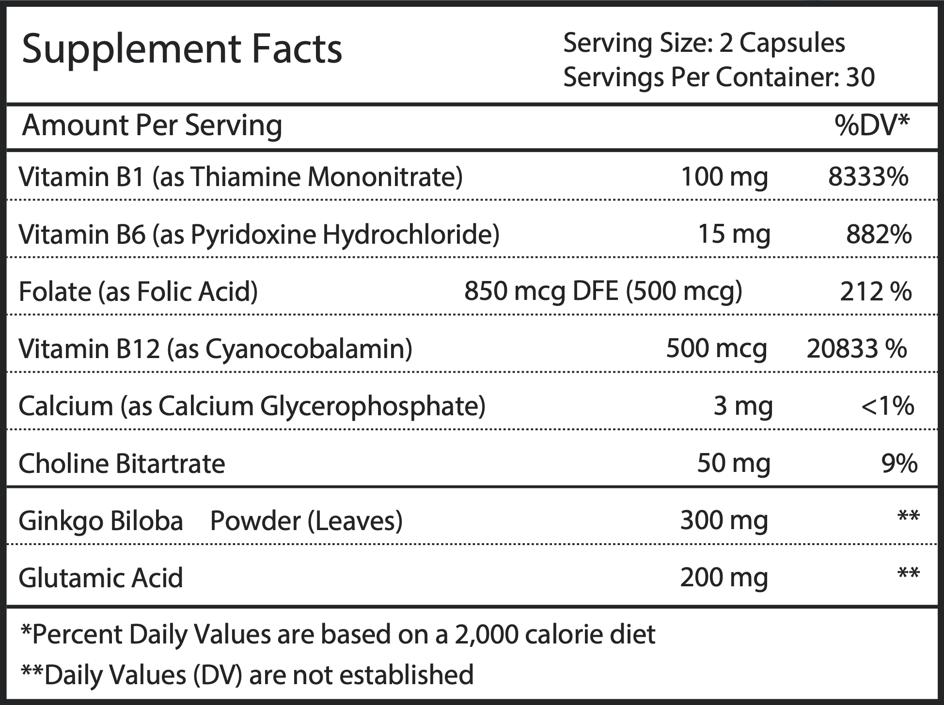 Choline is a critical component of acetylcholine, the neurotransmitter involved in learning and memory. Ginkgo biloba extract is one of the most researched botanicals for brain health, shown to enhance microcirculation in the brain, potentially improving alertness, processing speed, and memory recall. Glutamic acid, meanwhile, supports excitatory neurotransmission crucial for learning and focus.